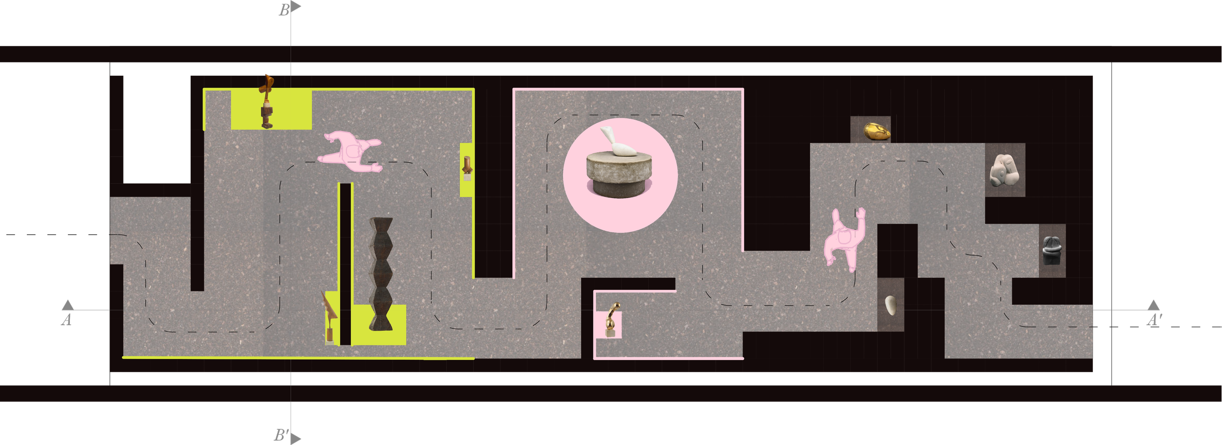 Yellow: In this stage, certain pieces are bathed in a strange, almost otherworldly glow, prompting viewers to engage in deep reflection. The yellow light encourages a thoughtful examination of the works, inviting us to consider their deeper meanings.